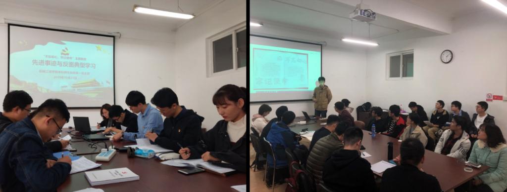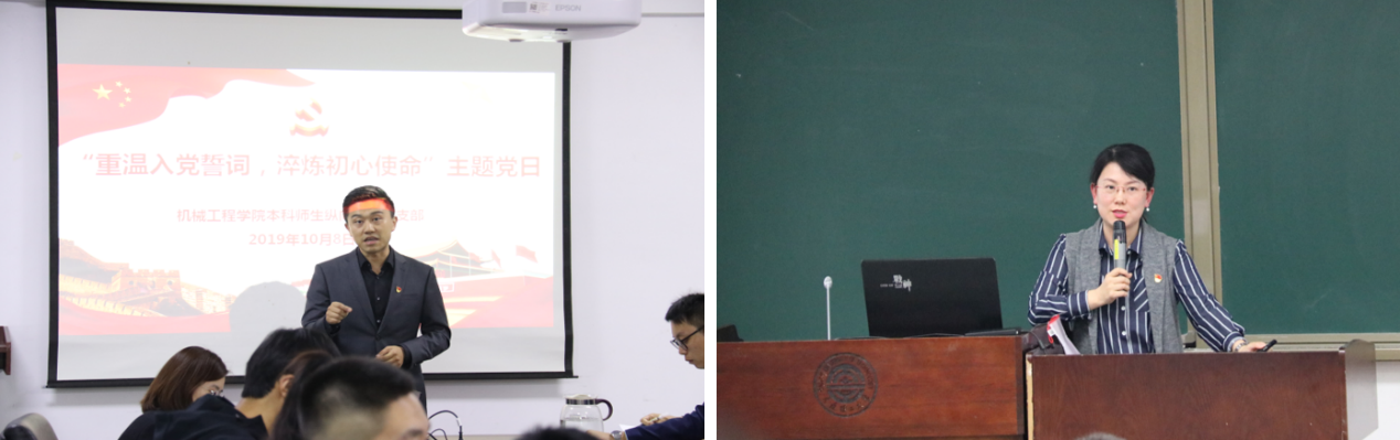 本科生师生两个党支部依托主题教育学习内容,开展主题党日活动。学生党员依次介绍不同历史时期的入党誓词,积极分享对党在不同时代背景下初心和使命的认识,用生动的语言、精美的图文和视频带领全体党员在学中思,在教中学,不断接受党性的洗礼。