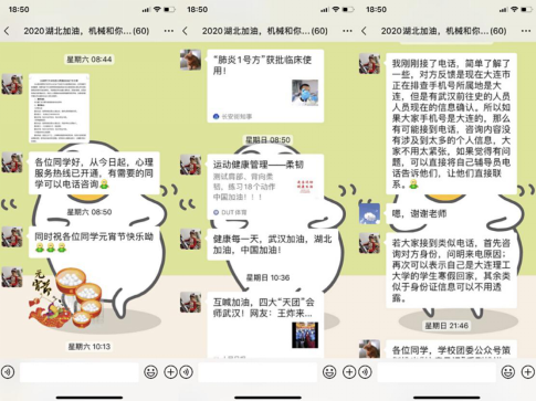 学院辅导员通过网络春雨谈心谈话,为学生提供心理健康保障,凝聚师生共识。建立湖北籍学生“战疫加油群”,每日发送疫情最新消息、好书推荐、健康知识等,化解时空障碍,传递温暖正能量。
