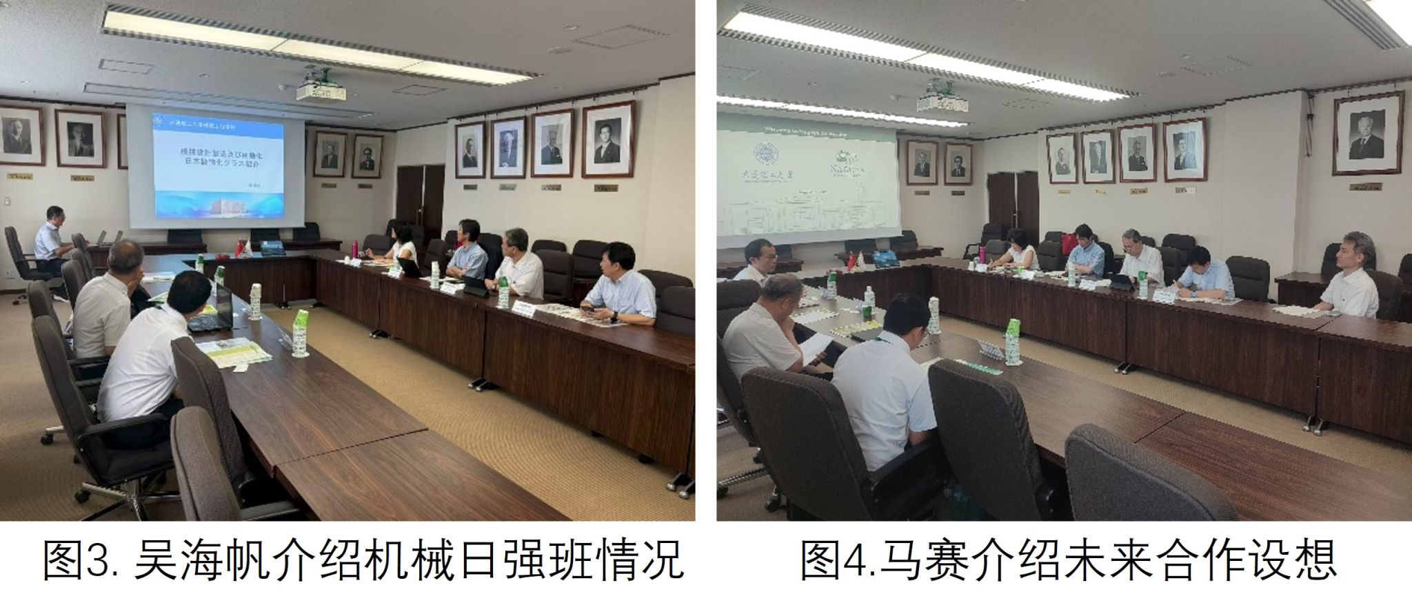 8月6日,名古屋大学副总长水谷法美、工学科长小乔真、国际教育中心主任伊东章子、中国交流中心副主任曾刚出席。在听取名古屋大学方面的情况介绍后,由吴海帆副教授介绍了我校机械工程学院日语强化班的基本情况(图3),马赛副教授介绍了未来与名古屋大学进一步合作的设想,双方进行了友好的交流和讨论(图4)。