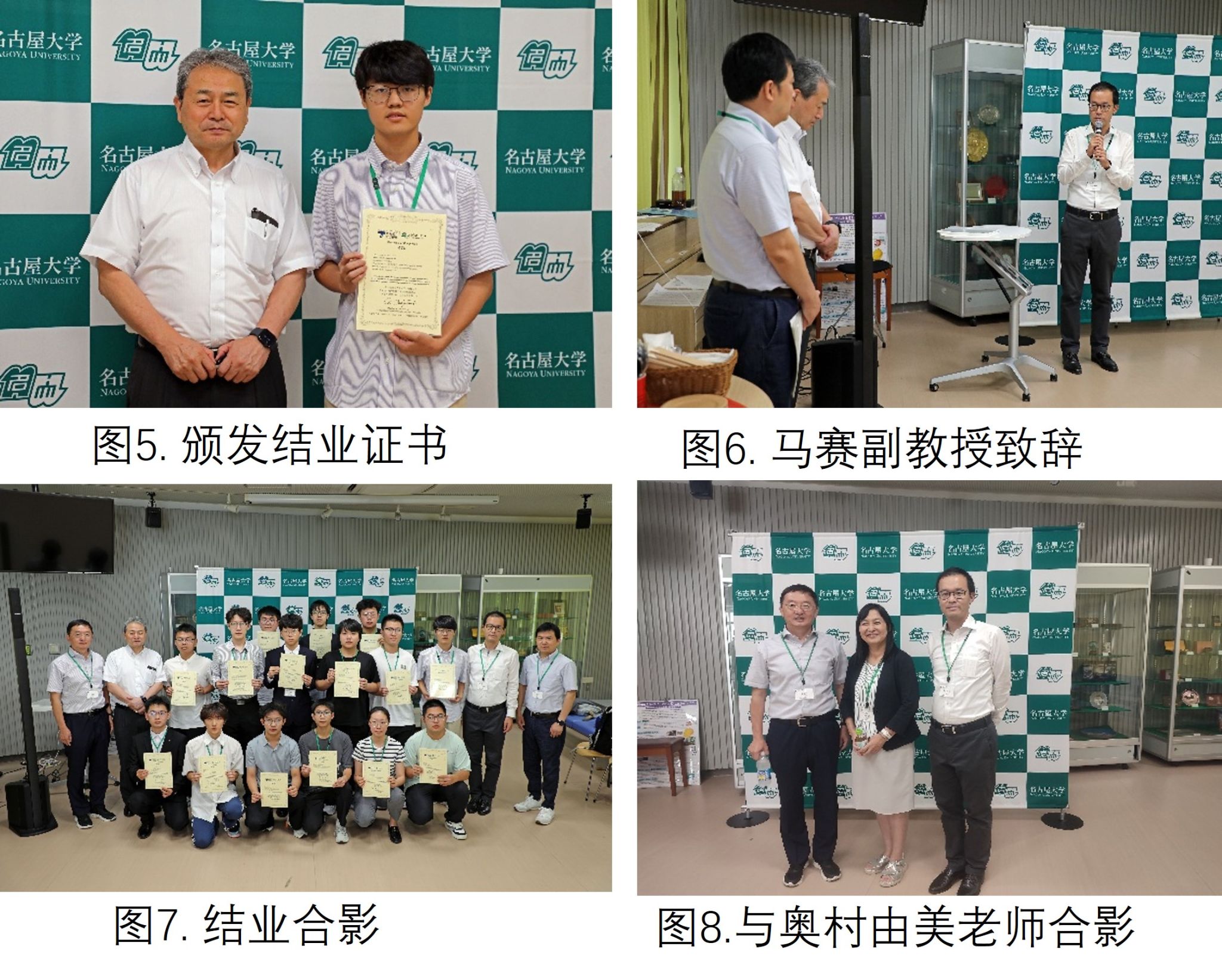 最后,8月8日下午举行了结业仪式。名古屋大学副总长水谷法美为全体学员颁发结业证书,并对同学们的表现表示赞赏。金奎炫同学作为学生代表领取证书并发言(图5),马赛副教授也代表教师致辞,感谢名古屋大学的悉心安排(图6)。最后大家合影留念(图7,图8)。