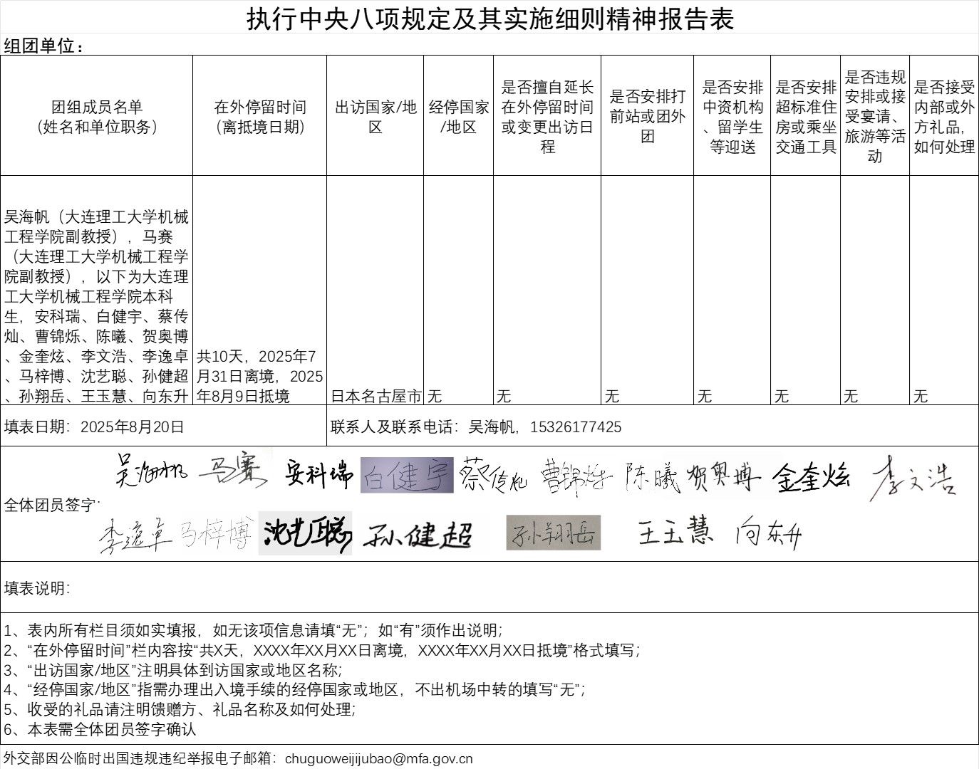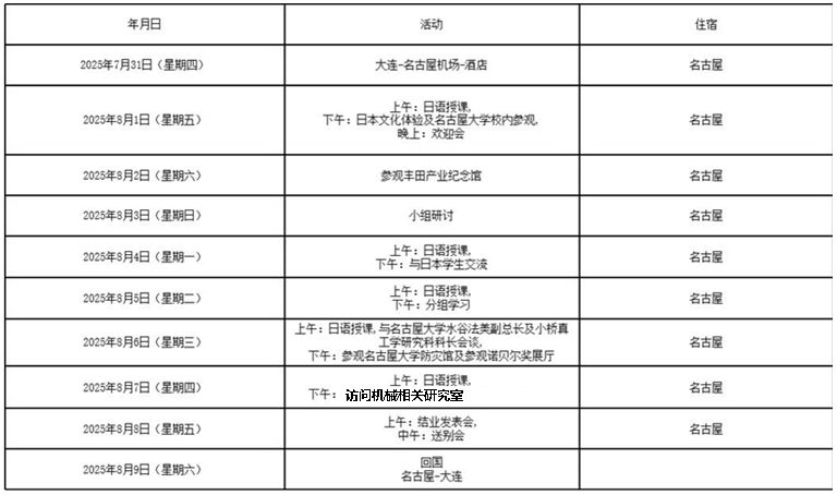 2025年7月31日至8月9日,由机械工程学院吴海帆副教授、马赛副教授带队,赴日本参加名古屋大学举办的暑期日本语研修班。代表团学生成员包括2024级机械工程学院机械设计制造及其自动化(日语强化)专业本科生安科瑞、白健宇、蔡传灿、曹锦烁、陈曦、贺奥博、金奎炫、李文浩、李逸卓、马梓博、沈艺聪、孙健超、孙翔岳、王玉慧、向东升等15名同学,共计17人。这是该专业学生首次以集体形式出国参加日语培训,得到了机械工程学院及国际合作处的大力支持。