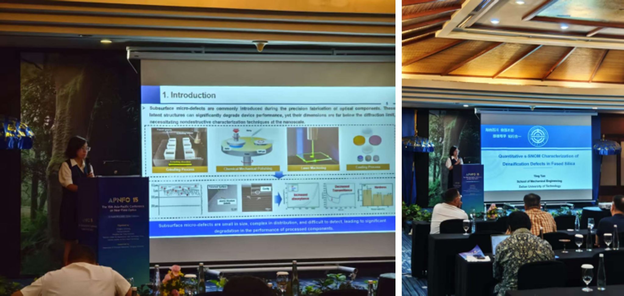 应清华东南亚中心邀请,机械工程学院闫英于2025年8月18—21日赴印度尼西亚巴厘岛,在清华东南亚中心参加第十五届亚太近场光学会议(APNFO15)。APNFO致力于汇聚亚太地区在近场光学、纳米光子学与超分辨成像方向的研究力量,交流前沿理论、关键技术与工程应用。会议期间,完成注册并系统聆听大会与分会场报告;在分会场作受邀报告《Quantitative s-SNOM Characterization of Densification Defects in Fused Silica》,介绍了中红外s-SNOM的幅相标定流程与定量反演方法,展示了对熔融石英致密化缺陷的深度敏感成像与对比验证结果。