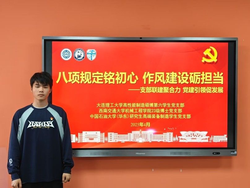在主题学习环节,大连理工大学高性能制造硕博第六学生党支部支部副书记冯嘉健对会议主题内容进行讲解。推动高质量发展,必须毫不动摇坚持党的领导、加强党的建设。党中央决定在全党开展深入贯彻中央八项规定精神学习教育,这是今年党建工作的重点任务。全体党员要增强定力、养成习惯,以优良作风凝心聚力、干事创业。要弘扬长征精神和遵义会议精神,以昂扬斗志走好新时代的长征路。