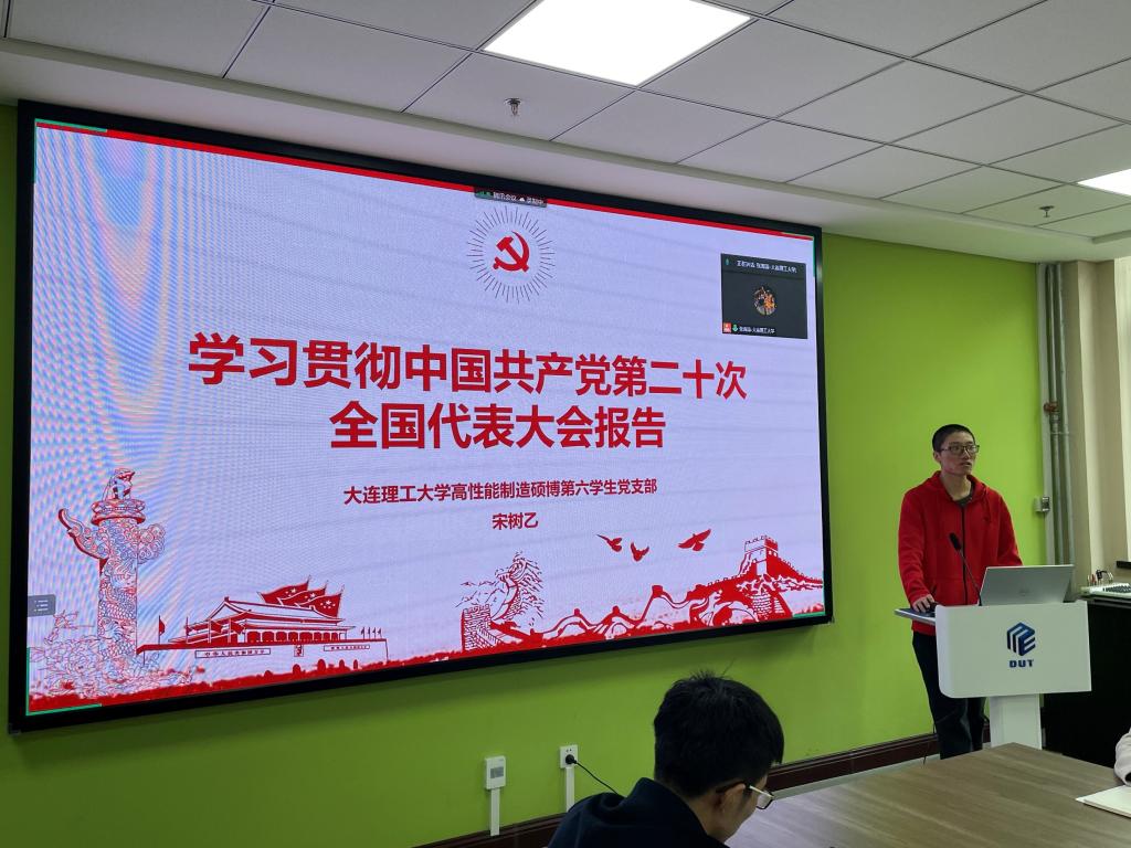 大连理工大学高性能制造硕博第六学生党支部副书记宋树乙同志就党的二十大精神进行了理论学习及研讨,宣传了中国新时代十年的伟大变革,宣传马克思主义中国化时代化的最新成果,宣传新时代新征程党和国家事业发展的大政方针和战略部署,引导支部成员坚定历史自信、增强历史主动。着重强调了党的二十大报告中实施科教兴国战略,强化现代化建设人才支撑的内容,紧密联系支部成员的科研生活,党的二十大精神以全面、系统、精准的方式进行了宣传贯彻落实。作为学院高性能制造团队的一分子,支部成员们更要坚定理想信念,弘扬科学家精神,充分领悟坚持创新在我国现代化建设全局中的核心地位,努力使自己成为德才兼备的高素质人才,为加快推进学校“双一流”建设汇聚发展动能。