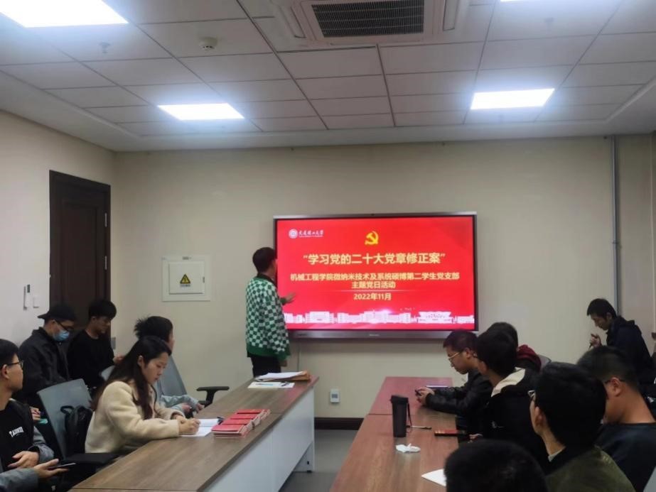 为深入学习贯彻党的二十大精神,引导党员深刻领会《中国共产党章程(修正案)》的重大意义和内容要点,切实把全体党员的思想和行动统一到党的二十大精神上来,11月19日,机械工程学院微纳米技术及系统硕博第二学生党支部在知方楼5155室开展“学习党的二十大党章修正案”主题党日活动,活动由李伟峰同志主持。