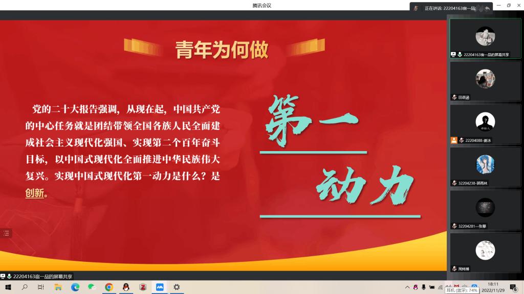 为了让青年同志们时刻牢记自己的身份与肩负的历史使命,坚定前进方向,成为有理想、有追求、有担当、有作为、有品质、有修养的青年学子,2022年11月29日,机械工程学院研究生党建工作中心以线上形式召开了“学习党的二十大,放飞激扬青春梦”青年成长分享会。本次分享会主要围绕着“青年为何做”、“青年如何做”以及“青年想要做”三个部分展开。