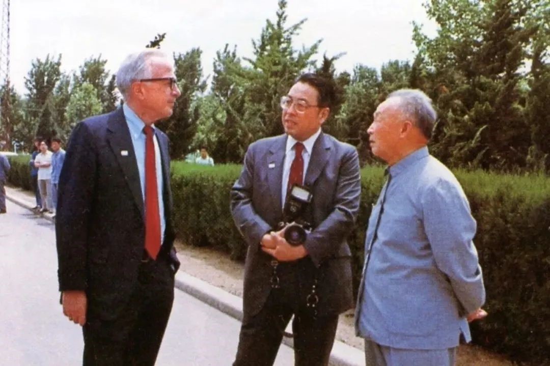 屈伯川与时任国家教育委员会主任朱开轩合影(1996年6月23日),这是屈老留下的 最后一张照片。