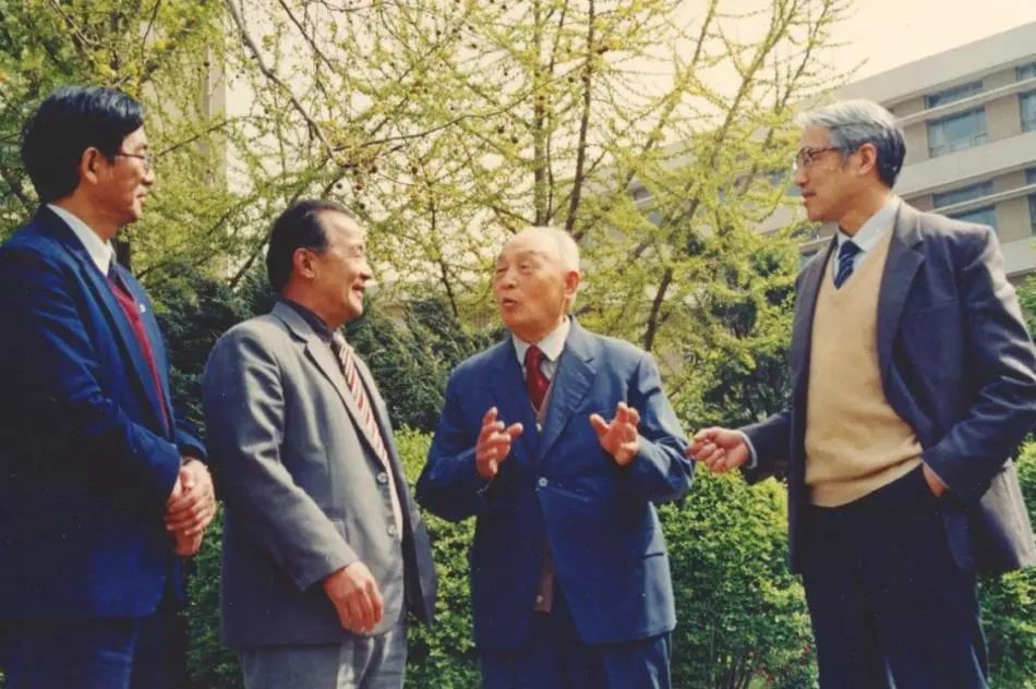 1981年9月,屈伯川主动退出一线,任大连工学院名誉院长,仍然关心着学校和国家的教育事业。此为1990年他与校党委书记钱冬生(右一)、校长金同稷(左二)、副校长林安西(左一)在一起研究工作。