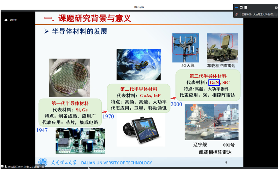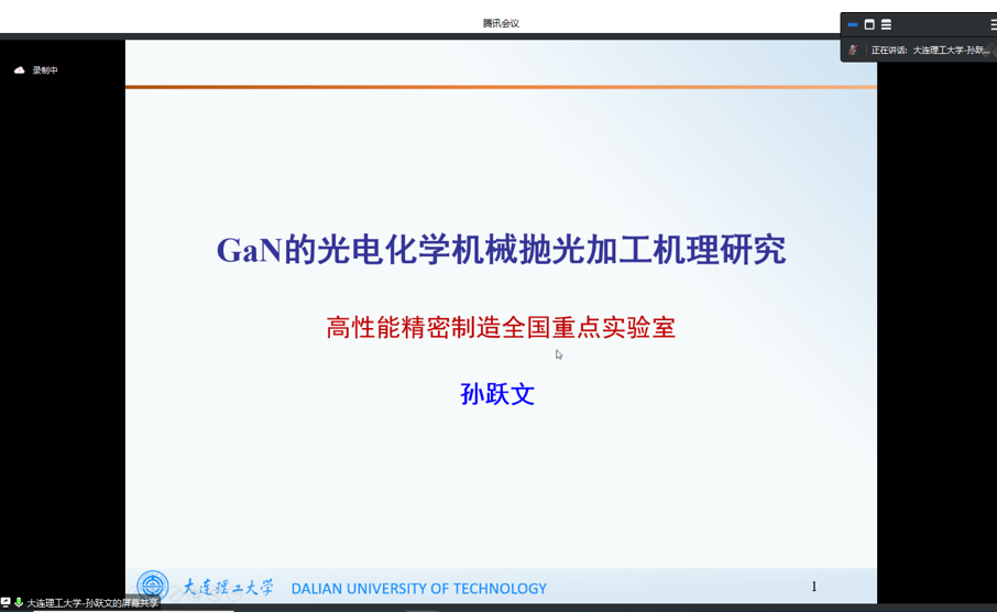 大连理工大学高性能制造硕博第六学生党支部孙跃文同志依托高性能精密制造全国重点实验室,对所开展的GaN材料的光电化学机械抛光加工机理研究进行了分享。孙跃文同志提到,原来的半导体材料Si、Ge、GaAs和InP等,因为材料本身的特性制约了相关行业的发展,团队经过考察对比后发现,GaN为目前半导体最优材料。她分享了GaN的加工过程,创新地提出了电化学抛光和机械抛光的复合抛光方法,并对相关方法的原理进行了简要介绍,深入浅出。