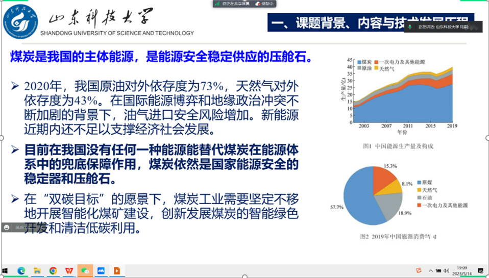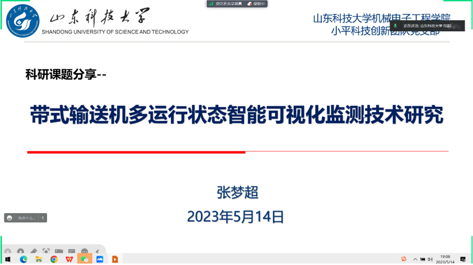 山东科技大学机电学院小平科技创新团队党支部张梦超同志进行了主题为带式输送机多运行状态智能可视化监测技术研究的科研分享,内容分为课题背景、输送负载量非接触式测量方法、输送带跑偏状态定量监测方法和个人感悟四个方面。张梦超同志强调了煤炭在中国的能源体系中具有兜底的保障作用,是国家能源安全的稳定器和压舱石。实现煤矿的全时空多源信息实时感知,风险闭环管控本质安全在生产实践中至关重要。张梦超同志所在团队研究的带式输送机测量方法在该领域有着举足轻重的地位。最后张梦超同志忠告师弟师妹们,做研究要坚持问题导向,要勤思考,要动手,时刻牢记习近平总书记的殷切嘱托,要脚踏实地,埋头苦干,不驰于空想,不骛于虚声。