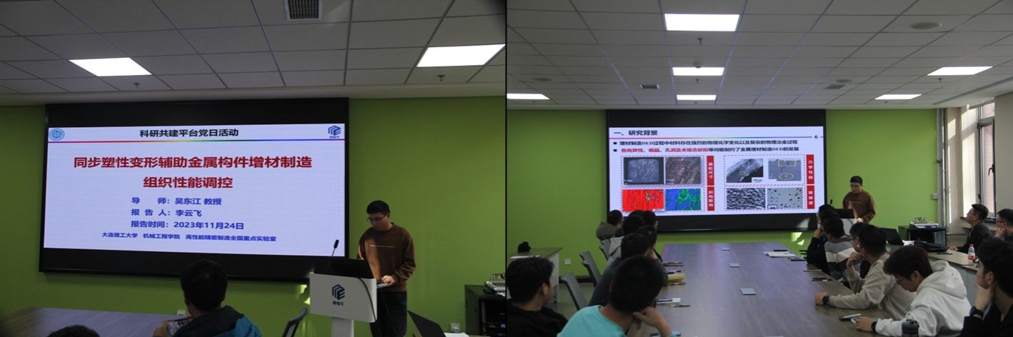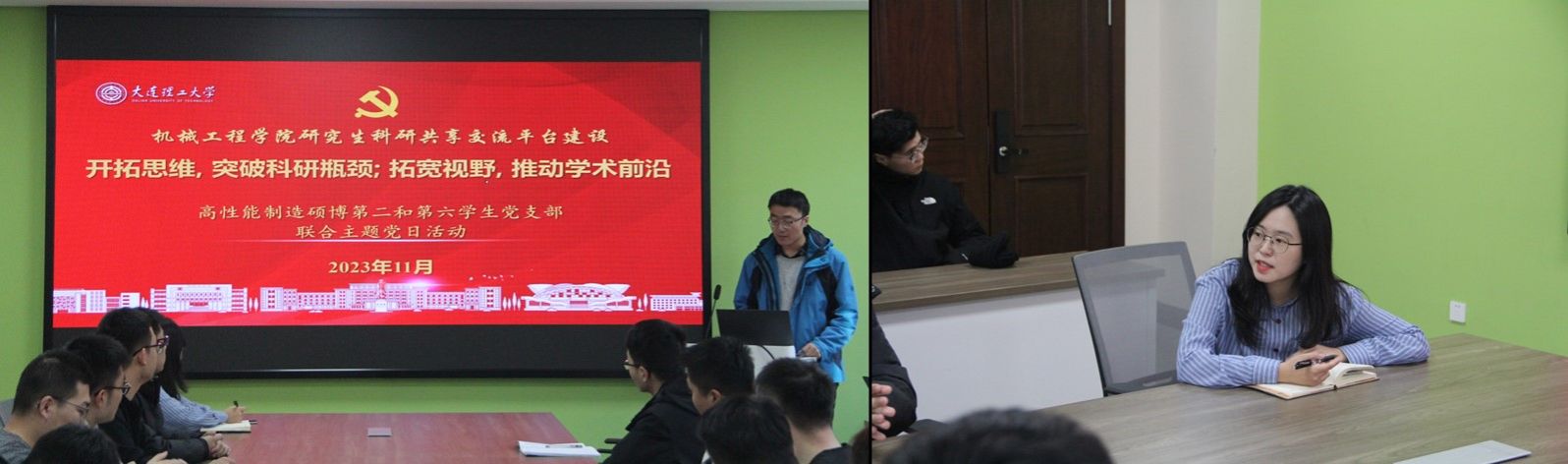 为深入推进落实学校“一融双高”建设实施方案,加强研究生党支部载体建设,扩宽研究生科研视野,促进学术创新并提高科研水平,2023年11月24日下午两点,高性能制造硕博第二学生党支部与高性能制造硕博第六学生党支部在知方楼3178会议室开展了“开阔思维,突破科研瓶颈;拓宽视野,推动学术前沿”的联合主题党日活动,会上学生代表沈浩亮、李云飞同志对自身研究内容进行了分享交流。本次主题党日由蔡昕彤同志主持,活动邀请了学院党委组织员姜雨杉老师前来指导。