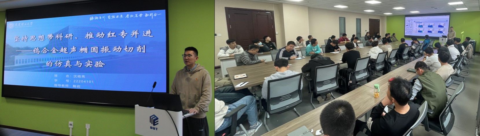 沈浩亮同志分享了高比重钨合金的需求背景、传统加工不足及超声椭圆振动切削加工优势,并介绍了自己课题规划和研究进展。李云飞、蔡昕彤等对该研究课题展现了浓厚兴趣,与沈浩亮从研究所用材料到研究内容进行了深刻交流讨论。