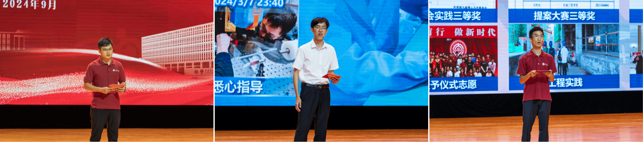 优秀学子代表、2021级博士生庞勇,2020级本科生费浩航及2021级本科生刘梁宇逐一分享了砥砺前行的奋斗故事,希望新生同学们向优秀榜样学习,追寻奋斗者的足迹,成为优秀的机械青年!