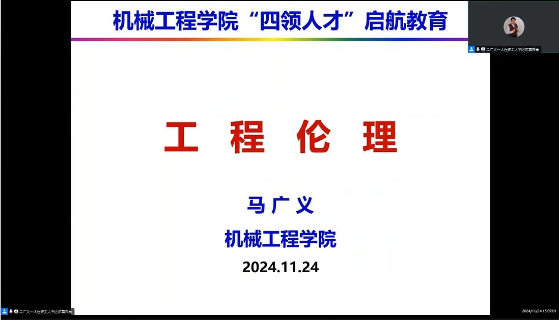 马广义结合人才培养专题,围绕培养“行业领军者、工程领创者”专题,讲授《智能制造与高端装备的伦理问题》主题课程。通过该课程,同学们全面了解智能制造和高端装备专业存在的伦理问题,启发对高端技术领域与社会发展关系的思考。