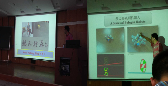 姚燕安教授在报告中主要介绍了自己十多年来在连杆式地面移动系统方向的科研历程、工程应用、艺术探索以及哲学思考。报告期间,姚燕安教授以幽默风趣的语言和大量的模型展示了自己的研究成果,提出多模式整体闭链连杆式地面移动系统的概念,应用变结构与变形控制技术,可获得类轮式、类履带式、类腿式、类球形、类蛇形等各种结构形态,并可切换实现轮式局部滚动、球形整体滚动、履带式多边形滚动、足式步行及爬行、蛇形滑行及蠕动等多种移动模式,从而可以用一套移动系统来适应各种各样的地形环境,并进而可采用多种变形与越障操作方式来通过极端复杂的障碍。在介绍学术成果的同时,姚燕安教授也介绍了自己在学术上的艺术探索以及哲学思考,各位师生受益匪浅。报告后,姚燕安教授与在场的老师和同学们进行了亲切交流,共同探讨了国内外机器人移动机构方向的研究进展及存在问题,并对未来机器人移动机构的发展给出了中肯的建议。