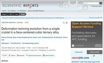 6月10日,Nature系列期刊《Scientific Reports》报道了主要完成者张振宇研究员及其硕士生杨松的工作,题为“Deformation twinning evolution from a single crystal in a face-centered-cubic ternary alloy”, Scientific Reports, 5, 11290, (2015).