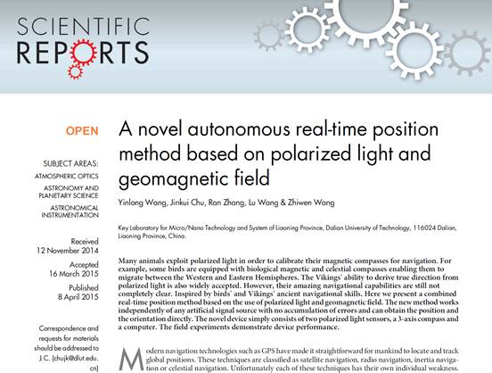 近日,我院王立鼎院士研究团队褚金奎教授课题组,在全球定位技术的研究中取得创新性成果,在《Nature》出版社系列期刊《Scientific Reports》上发表了题为“A novel autonomous real-time position method based on polarized light and geomagnetic field”的学术论文(Scientific Reports 2015, DOI: 10.1038/srep09725)。
