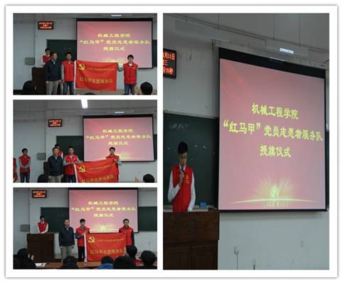 机械工程学院“红马甲”党员志愿者服务队以累计开展志愿服务28次,参与志愿服务620余人,累计服务超过920小时的奉献精神在同学中小有名气。在入党启蒙教育大会现场,“红马甲”党员志愿者服务队创办成员代表、来自机械-本-2012-01学生党支部的王国全、孙景慧、贺广志同学分别从奉献、担当、传承三个角度,通过视频短片,向大家介绍了红马甲的成立、理念、活动内容以及传承精神。他们在服务队建立之初也遇到过阻碍,看到过同学们不理解的目光,但是他们坚信红马甲的行为是正确的。什么是雷锋精神?大学生党员的价值应该体现在哪里?机械-本2012-01学生党支部“红马甲”党员志愿者服务队用实际行动和坚持向所有人证明了党员的意义。“红马甲”党员志愿者服务队的所有成员期望看到“红马甲”精神一直传承下去,以踏石留印、抓铁有痕的韧劲,持之以恒,久久为功,以爱心为支点,以奉献为能量,让红马甲不仅帮助了人,温暖了人,也带动了人,引领人了,渐渐形成强大的涟漪效应,让“红马甲”成为党员志愿服务的名片!随后,康旭东书记将鲜红的旗帜授予2013级、2014级、2015级“红马甲”党员志愿者服务队,完成机械工程学院“红马甲”党员志愿者服务队授旗传承仪式。服务队成员发自心底的真情流露、那份沉甸甸的党员担当,深深感动着每一名新生,也为新生们播种了一颗何为党员、何为责任的种子。