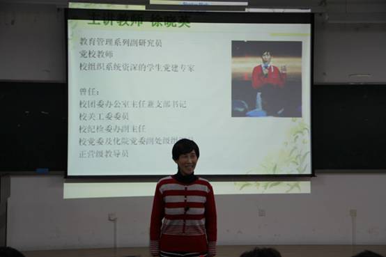 机械工程学院入党启蒙教育大会还邀请到了我校组工系统资深教师徐晓英老师为新生们上了一堂入党理论和规划的专业课。徐老师通过分析当前我校党建工作现状和在大学生中发展党员的必要性,从端正入党动机、加强理论学习、如何以实际行动争取组织入党和思想入党为新生入党做出专业规划。她在讲述过程中不断引用十八大和习近平重要讲话精神激励学生,“青年大学生是实现‘中国梦’的生力军,要发扬‘可爱’、‘可敬’、‘可贵’和‘可为’的精神,执著追求自己的人生理想,并为之付出不懈努力,才能不愧对于人生”,特别是徐老师所引发的《西行漫记》封皮上1936年的号手——1955年被授予少将军衔的谢立全将军的感人故事,使同学们更加缅怀先烈的牺牲精神,进一步明确了入党目的。徐晓英老师在报告中不断与学生进行互动,现场氛围十分活跃,精彩的报告使新生产生强烈共鸣,不时响起热烈的掌声。