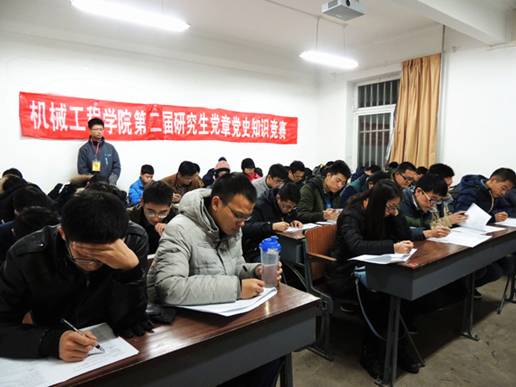 为贯彻十八届五中全会精神,推进“三严三实”专题教育,全面了解抗战大阅兵的历史意义,增强同学们自觉学习党章、遵守党章、贯彻党章的意识。2015年11月26日18:00,机械工程学院党委开展了以“贯彻十八届五中全会精神,争做机械研究生党员模范”为主题的第二届研究生党章党史知识竞赛。