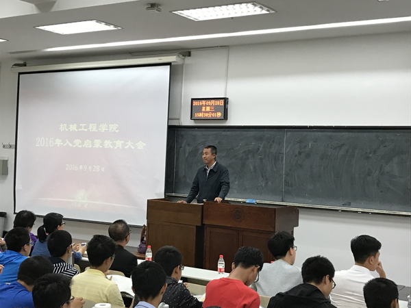 为引领大学新生树立正确的政治信仰与人生追求,加强大学新生理想信念教育,让2016级新生更好地了解党的基本知识和入党要求及程序,帮助各位新生树立正确的入党动机,积极向党组织靠拢。9月28日15:30,机械工程学院入党启蒙教育于综合一号教学楼353举行。学院党委书记康旭东、学院党委副书记兼副院长于盛军、学院党委副书记兼副院长边悦玲、校组工系统资深学生党建专家季亚男老师、学院党委组织员庞丹出席会议,2016级新生辅导员王云赫、金晗以及384名本科新生参加了大会,大会由庞丹主持。