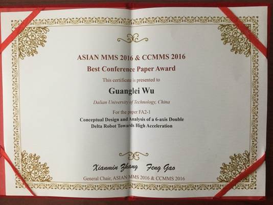 本次会议共录用了123篇文章,由Springer出版社出版。经过论文宣读、审稿人推荐、评审小组复审,王德伦教授指导的博士生吴煜的文章“The Kinematics Invariants in Testing Error Motion of Machine Tool Linear Axes”,获得了最佳学生论文奖提名(共5个)。吴广磊老师的论文“Conceptual Design and Analysis of a 6-Axis Double Delta Robot Towards High Acceleration”获得了最佳会议论文奖提名(共3个),并最终获得了最佳会议论文奖。