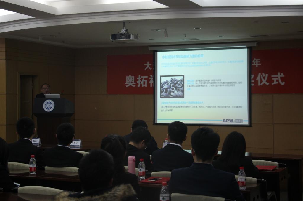 武子全先生代表沈阳奥拓福科技股份有限公司在致辞中向获奖同学表示热烈的祝贺,表示在公司的发展过程中深刻认识到知识和人才对企业核心竞争力形成、企业发展的重要性,认同大工“厚德、笃学、知行、合一”的治学精神,秉承回馈社会、科教兴国的理念,决定在大连理工大学设立奖学金,以激励同学们刻苦专研、投身于科学研究与生产实践,为中国机械装备的进步与发展、追赶世界先进水平做出贡献。希望同学们经得起诱惑、耐得住寂寞,打好基础,成为栋梁之才。