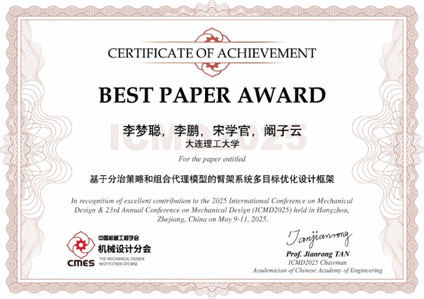 会上,我院何西旺博士、庞勇博士等作数字孪生、代理模型、大口径反射镜、智能挖掘机等方面的学术报告。同时,研究生李梦聪(导师:宋学官、阚子云)的论文《基于分治策略和组合代理模型的臂架系统多目标优化设计框架》,获评本次会议的最佳论文奖(共18项)。该研究从CAD、CAE、多目标优化三个层次出发,将代理模型和优化算法融入全工作流程以增扩设计域和缩减计算规模,开发了具有自主知识产权的泵车臂架优化设计软件,助力行业龙头企业实现了多个型号泵车臂架的多目标优化,为重型工程机械的智能设计与制造提供了支撑。