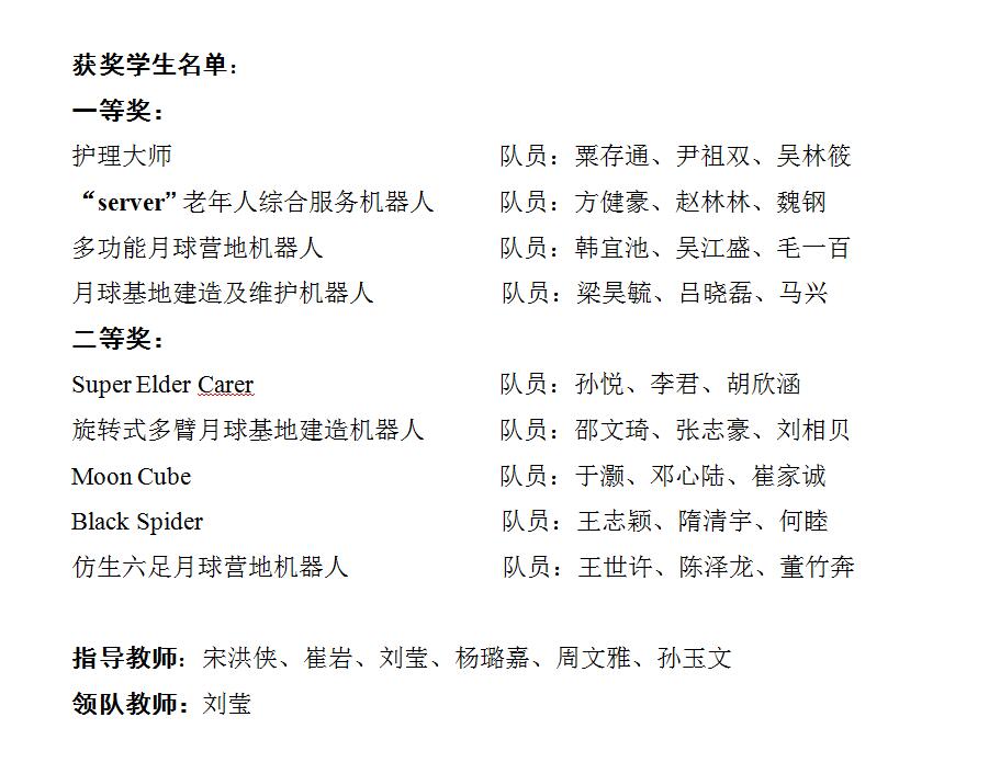 本届大赛以“精心照料体贴入微”为主题,内容包括“康复服务机器人的设计;老年人服务机器人的设计;家用服务机器人的设计;月球营地机器人”。大赛包含预赛、决赛现场答辩和决赛现场设计三个环节,力求全面评价学生的综合素质和水平。决赛现场答辩展示环节,队员们对作品进行了精彩的展示与讲解。决赛现场比赛可携带各种纸质及电子参考资料,但拒绝网络交流。本届现场决赛题目为针对老年人日常生活,在无电梯的老旧居民住宅楼、养老院中解决“上下楼”难题,贴合社会实际,需要参赛学生运用创新设计方法,提出技术解决方案,有相当的难度。最终,我校护理大师团队、“server” 老年人综合服务机器人团队、多功能月球营地机器人队、月球基地建造及维护机器人团队获得一等奖;Super Elder Carer团队、旋转式多臂月球基地建造机器人团队、Moon Cube团队、Black Spider团队、仿生六足月球营地机器人团队获得二等奖。