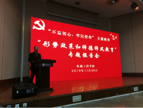 为进一步加强“不忘初心、牢记使命”主题教育形势政策和警示教育工作, 2019年11月26日下午,机械工程学院党委组织学院党员在研教楼报告厅开展形势政策和师德师风专题讲座。学院党委邀请我校经济管理学院副教授丁永健和党委教师工作部副部长段大勇分别作题为《中美经贸争端原因与应对》、《新时代高校教师的师德修养》的专题讲座。学院领导干部、党委委员、纪委委员、全体党支部书记、全体教工党员、部分学生党员参加讲座。