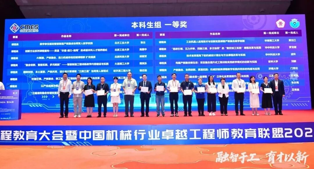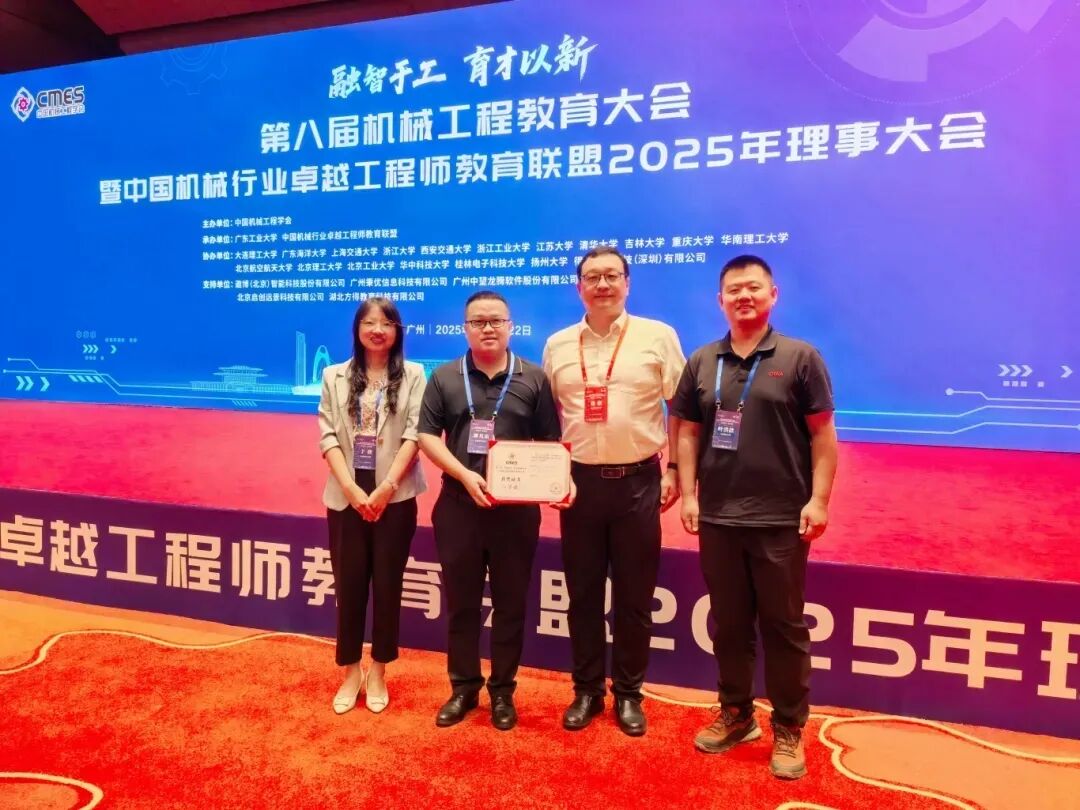 2025年9月19日-21日,在广州召开的第二届“科德杯”中国机械行业产教融合教育教学创新大赛全国总决赛上,工程训练中心老师薄其乐、于欣、叶洪歆、刘新等代表项目团队以“融合创新、智能实践、多元赋能”——智能制造工程训练教学内容建设与实践为题目,围绕项目背景、解决问题的举措、项目创新点和产教融合成效及推广展开汇报,获本科生课程组一等奖。