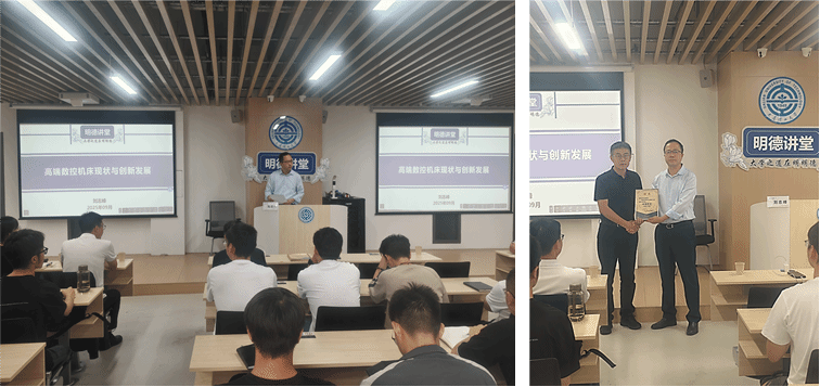 本次主题党日活动由两个支部共同策划,紧扣“党建与学科发展深度融合、教工与学生支部协同共进”的工作理念。讲座伊始,机械工程学院党委书记亓昌代表学院向刘志峰教授颁发“明德讲堂讲座学者”证书。他指出,作为高性能制造教工党支部的联系人,此次参与支部主题党日活动,深刻感受到基层党组织在服务国家战略中的重要作用。高端数控机床作为国防军工与关键经济领域的核心战略装备,其技术突破是落实新型举国体制攻关要求的关键抓手,两个支部联合举办此次活动,正是基层党组织响应国家科技强国建设号召的具体行动,也是深化教工与学生支部共建、推动党建与业务融合的生动实践。