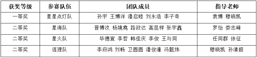 经过激烈的角逐,我校参赛团队共获得国赛一等奖1项、二等奖3项,另外还有2支团队分别获得全国初赛二等奖及三等奖。获得国奖学生名单: