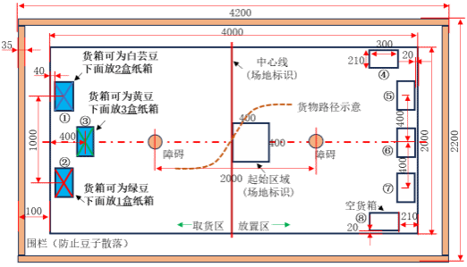 正式比赛的时间为4分钟。计时开始后中间不暂停,参赛作品需从竖直的中心线取货区一侧将1-3号货箱中的货物取出,按照抽签结果放置在放置区对应的货箱内(如表1所示:将黄豆放置在4号货箱,绿豆放置在5号货箱,依此类推)。比赛时间内,因参赛作品故障或异常造成的比赛失误,参赛队伍可示意裁判停止比赛和计时,并以此时状态计成绩;若参赛作品将货箱推倒,或置物台推动导致货箱或置物台超出场地边界线,或障碍物被撞倒(障碍物没撞倒可以继续比赛),现场裁判应停止比赛和计时,并以此时状态计成绩。上述情况下,参赛队员也可向裁判申请重新开始。获准后,不用重新抽签,已搬运的货物需要清除出场外,不得倒回原取货区货箱。参赛作品需从比赛初始位置再次开始搬运。重新开始之前,参赛队员自行决定是否清理掉落的货物,但开始搬运后不允许清理。整个过程计时不停,直至4分钟停止计时,比赛即终止,以最后一次搬运结果计算最终成绩。上述情况,均只给一次重新开始的机会。参赛作品搬运货箱过程中,货箱和参赛作品与地面接触的主体部分不得超出比赛场地,空中部分允许超出。