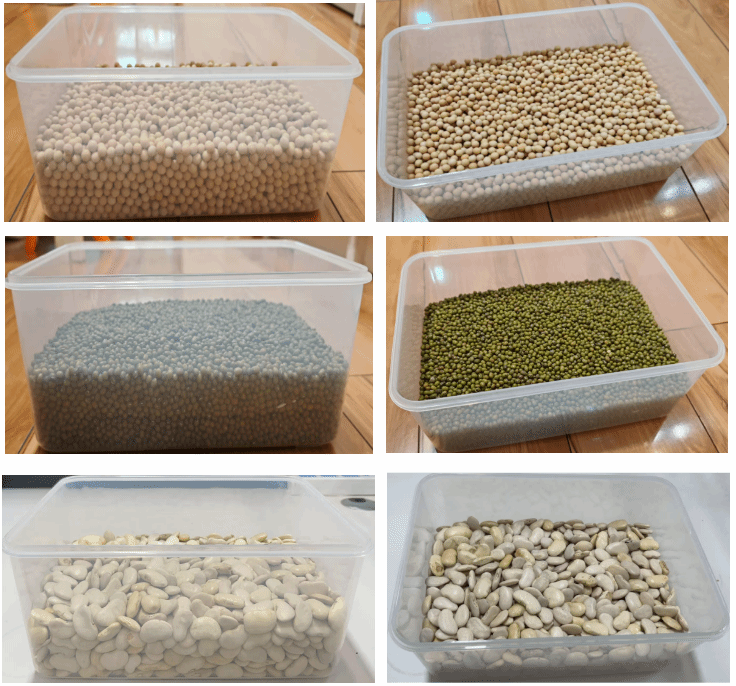 初始状态下,每个货箱内应装有指定散料货物。三个货箱分别放白芸豆1.8kg±50g,黄豆2.1kg±50g,绿豆2.5kg±50g,货物堆积应平整,堆积高度波动应控制在±10%。正式比赛时,举办方需当面拆封真空包装的各类货物。参考链接如下: