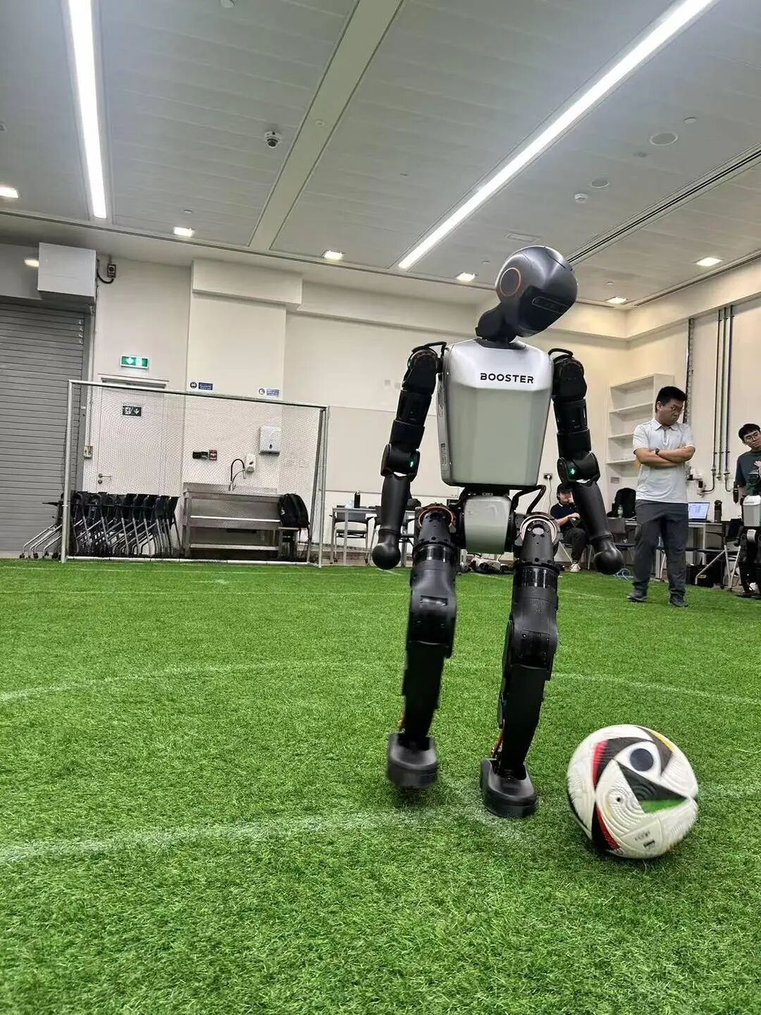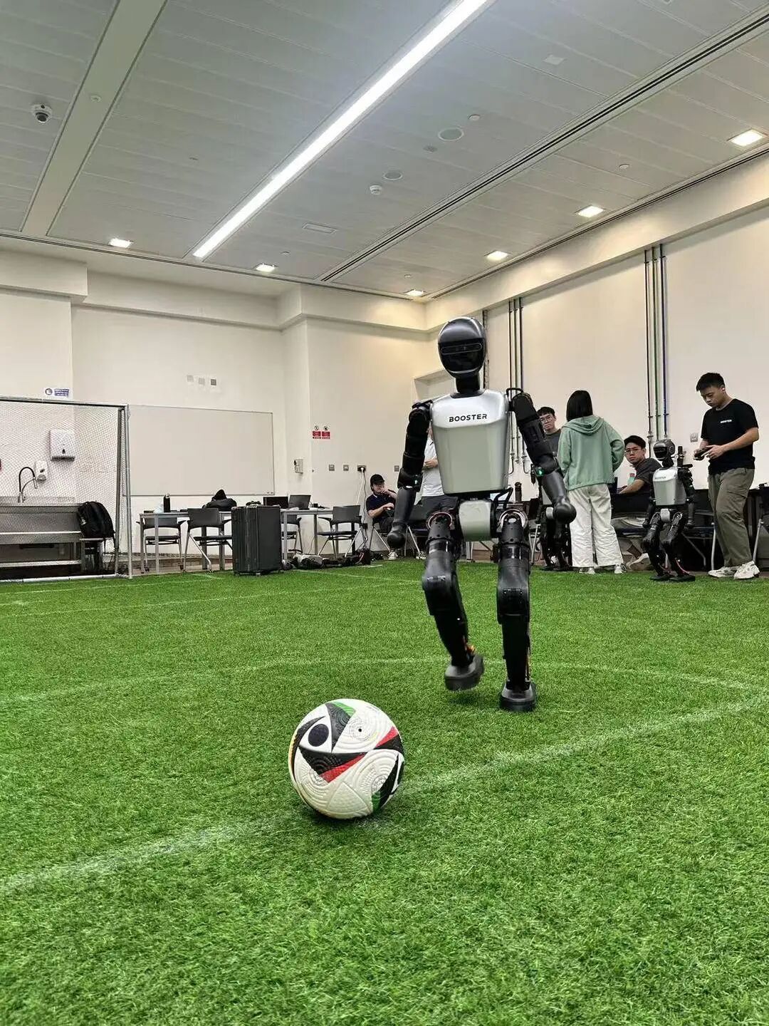训练的第一步,是让机器人“看清赛场、站稳身姿”。“它们就像刚学步的孩童,得先学会认路、识球。”团队依托RGB相机,采集了海量足球、球场标识点数据,反复迭代训练视觉神经网络模型。同时,团队优化了赛场定位逻辑,避免机器人误将球踢向边界外,或是自主跑离赛场范围。