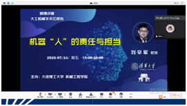 在报告开始之前举办了“明德讲堂”讲座学者线上聘任仪式,学院副院长刘巍教授代表学院向刘辛军教授颁发聘任证书。随后,刘辛军教授为各位老师和同学带来了“机器‘人’人的责任与担当”的学术报告,主要介绍了当前机器人需求的国内外背景,展望了机器人发展的趋势,并以抗疫机器人为例,介绍了机器人技术在体温筛查、病毒咽拭子检测、高速测温等方面的应用。最后,刘辛军教授与大家分享了今年面对新冠疫情,带领整个团队日夜兼程以最快的速度研发出了 “荼与”测温机器人的过程,特别提到了研究生团队面对困难,主动请缨奔赴现场、分担工作,处处闪烁着研究生们的责任心与担当感。在整个团队的努力下,所开发出的测温机器人在校园、医院等公共场所得到了大量应用,获得多个媒体的报道以及防疫一线单位的一致认可。