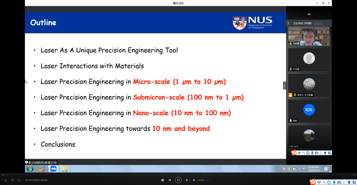 听名师智慧高山仰止,品大学之道在明明德。5月15日,新加坡工程院院士、新加坡国立大学终身正教授、前沿研究和技术创新中心主任洪明辉教授受邀莅临“明德讲堂”,在线上作了题为“推动激光精密工程从微尺度走到纳尺度的进展、挑战和机遇”的学术报告。