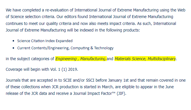 近日,由郭东明院士任国内主编的《极端制造》期刊(International Journal of Extreme Manufacturing, IJEM)被Science Citation Index Expanded(SCIE)数据库收录,IJEM的首个影响因子将于2022年6月产生。