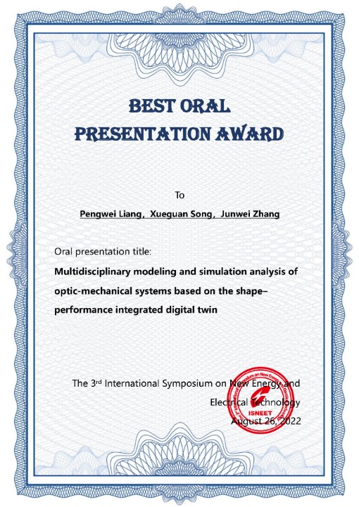 博士研究生梁朋伟(导师:宋学官教授)在ISNEET 2022国际会议上汇报了基于数字孪生的光-机系统多学科建模仿真的研究进展(Multidisciplinary modeling and simulation analysis of optic-mechanical systems based on the shape–performance integrated digital twin),并获得会议的“最佳口头报告奖”。