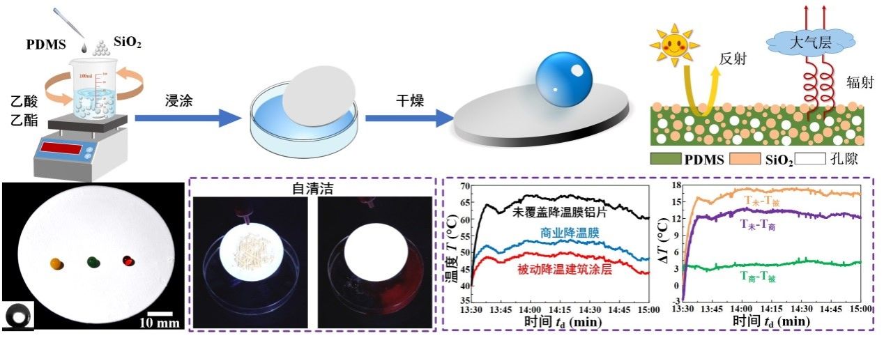 参赛团队“三伏吟寒”通过实验发现涂层的降温效果明显,防污效果显著。在太阳光辐射强度为950 W/m2 ~ 1200 W/m2的日间测试涂层的降温能力,发现与未覆盖涂层的对照组相比,被动降温建筑涂层可降温15 ℃ ~ 18 ℃;相比市售商业降温膜,温升可降低2.5℃ ~ 4.5℃。水滴接触被动降温建筑涂层表面后,会快速滚落并带走表面的灰尘,使得表面保持干燥清洁。将泥水浇洒在被动降温建筑涂层后,涂层表面未被泥水污染,仍保持优异的降温性能;而商业降温膜表面与泥水接触后会有明显的污染物残留,降温能力显著下降。被动降温建筑涂层还能有效抵御酸、碱等腐蚀性液体的侵蚀,在户外放置30天、紫外光照30天、及70℃下加速老化100 h后仍具备优异的防水性能和降温能力。被动降温建筑涂层还能有效抑制水箱中吸热能力较弱的水的温升,在不同应用场合下呈现出良好的降温能力,具有广阔的应用前景。
