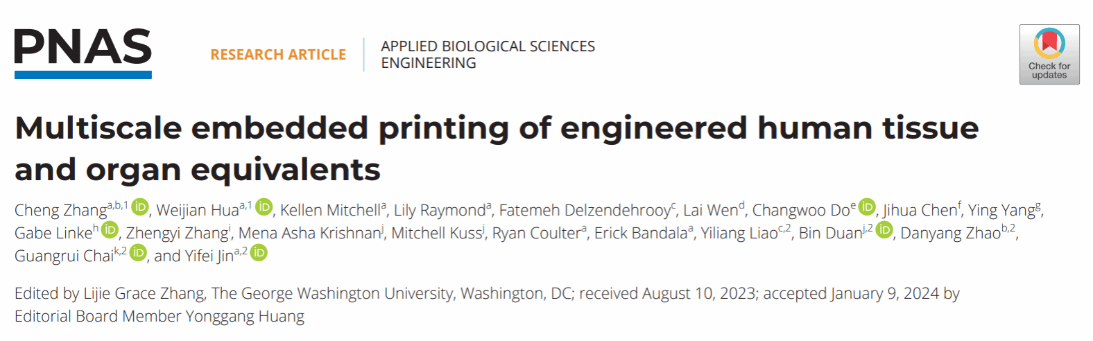 近日,大连理工大学机械工程学院赵丹阳教授课题组和美国内华达大学雷诺分校机械工程系Yifei Jin课题组等团队合作,针对多尺度复杂组织/器官体外精准制造这一长期困扰生物打印领域的难题,提出了多尺度浸入式打印策略(Multiscale Embedded Printing,MSEP),实现了多尺度人体组织和器官的体外制造,从而有效验证了MSEP技术在构建复杂人体组织和器官方面的巨大潜力。该研究成果以“Multiscale embedded printing of engineered human tissue and organ equivalents”为题发表于美国国家科学院官方学术期刊《Proceedings of the National Academy of Sciences (PNAS)》。
