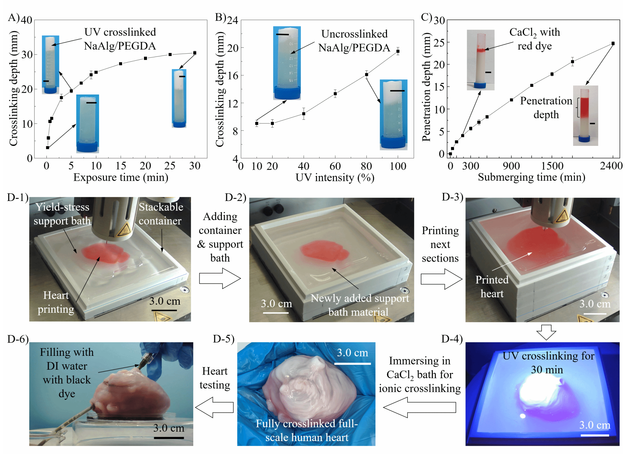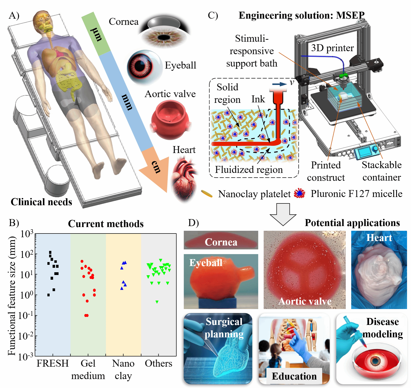MSEP技术采用刺激响应型屈服应力流体作为支撑浴,该支撑浴由温敏性水凝胶Pluronic F127和屈服应力添加剂纳米粘土组成,同时具有温敏性和屈服应力特性,可在打印过程中快速添加并在室温下提供稳定支撑。基于MSEP技术,本研究提出了一种动态层高控制策略,实现了具有微米级表面粗糙度的工程角膜结构的3D打印。同时,利用MSEP技术制造了具有毫米级特征尺寸的异质人类眼球和主动脉瓣模型,以及具有分米级尺度的全尺寸人体心脏模型。该研究成果为多尺度人体组织和器官的精准制造提供了新的方法和可能性,为未来的组织工程研究和人造器官移植奠定了重要的技术基础。