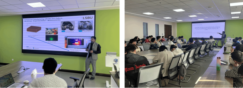 在报告中,Saurav Goel教授重点介绍微/纳尺度制造技术与应用,围绕微/纳尺度制造在日常生活中的应用,尤其在减少材料、空间和能源的消耗,提高系统的整体效率方面。结合原子尺度的分子动力学模拟,生动详细地介绍了硬脆材料如金刚石、碳化硅的切削变形过程以及摩擦磨损机理,探讨了亚微米尺度上制造和材料在微型化中的相互作用关系。学术报告现场座无虚席,反响热烈,在场师生表现出对报告内容的强烈兴趣。提问环节,Saurav Goel教授和在场的50余名本科学生展开了深入的讨论交流,进一步激发了同学们的研究热情,拓展了研究视野。讲座在同学们热烈掌声中圆满结束。