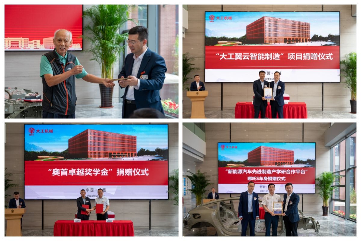 在建院(系)75周年系列捐赠仪式活动现场,1956级校友虞至正为学院捐赠个人在大工学习期间的课堂笔记、庆祝建校10周年的纪念书签,作为学院院史馆的重要历史资料,此外还向学院捐赠了黄胄的《群驴图》。大连天翼信息科技有限公司董事长、1994级校友张煜先生,浙江奥首材料科技有限公司创始人、2000级校友侯军先生,分别签订捐赠协议,设立了“大工翼云智能制造”项目、“奥首卓越奖学金”项目,用于支持学院优秀在校师生的奖励。合众新能源汽车股份有限公司总工程师、1989级校友赵坤民先生,代表合众新能源汽车股份有限公司签订“新能源汽车先进制造产学研合作平台”项目,捐赠“哪吒S”汽车白车身用于学院教学科研工作。