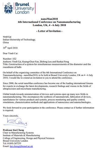 The International Symposium on Brittle Materials Manufacturing(ISBMM2018)和International Conference on Nanomanufacturing是加工领域十分重要的研讨会,爱尔兰国立都柏林大学又称为都柏林大学学院(University College Dublin,简称UCD)和伦敦布鲁内尔大学(Brunel University London),是世界著名研究型学府,爱尔兰和英国顶尖大学之一,房丰洲教授和程凯在材料加工方面有着多年的研究经验,在此领域做出了卓越贡献,此次研讨对我课题组硬脆材料加工相关课题有着重要意义。