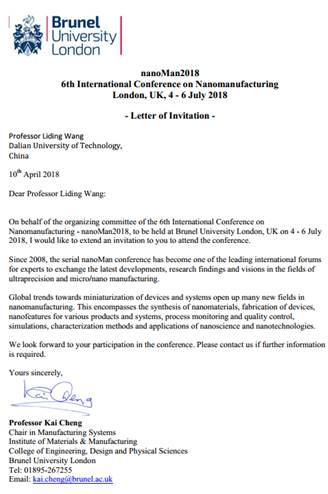 应ISBMM大会主席Fengzhou Fang和Nanoman大会主席Kai Cheng邀请,我单位王立鼎、蔡引娣拟赴爱尔兰和英国参加国际脆性材料加工研讨会(The International Symposium on Brittle Materials Manufacturing ISBMM2018)和第六届纳米加工国际会议(6th International Conference on Nanomanufacturing Nanoman2018)。现将该团组拟出访情况公示如下: