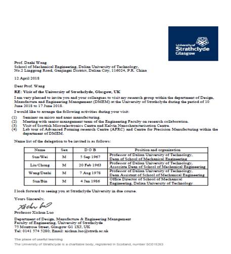 应英国特莱斯特大学设计制造与工程管理系罗熙淳教授、英国伦敦大学学院机械系伦敦大学学院Mohan教授和法国FEMTO-ST工程科学研究所Najib KACEM副教授等的邀请,我单位孙伟等4人拟赴英国和法国高校开展引进人才与交流访问。现将该团组拟出访情况公示如下: