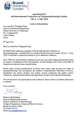 应第6届纳米制造国际会议(nanoMan2018)会议组委会主席 布鲁内尔大学Kai Cheng教授邀请、诺丁汉大学 Xiaogang Yang教授邀请,我单位 高航、王宣平 拟赴 英国 伦敦、诺丁汉国家(地区)进行工作访问(学术交流)。现将该团组拟出访情况公示如下: