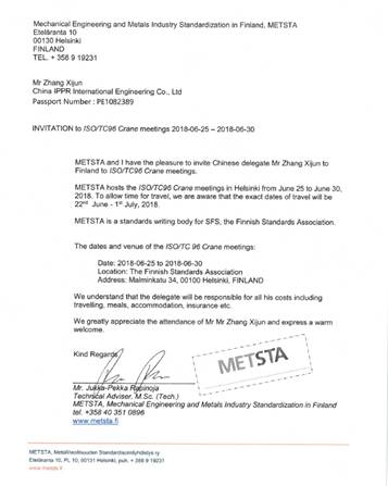 2018年6月25日-6月30日在芬兰赫尔辛基召开国际ISO/TC96起重机标准系列技术会议,该会议负责起重机械包括流动式起重机、塔式起重机、臂架起重机、桥式及门式起重机等的设计、术语、钢丝绳、测试方法、使用、操作及维护相关国际标准的制修订工作。其制定的2万多项国际标准在构建全球治理体系和服务国际贸易中发挥着重要的技术规制作用。